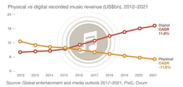 This is technological disruption illustrated. The demonstrable change in recorded digital music revenue generation...even as Spotify continues to bleed cash as users "lov[e] it to death"...
