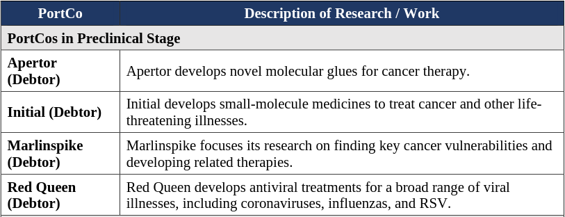Collectively, the debtors constitute a biotech VC enterprise, with ATLS handling opex and the filing portcos and eleven non-debtor affiliates (together with the filing portcos, the “portcos”) engaging in the actual science. For the filing portcos, their businesses are as follows: