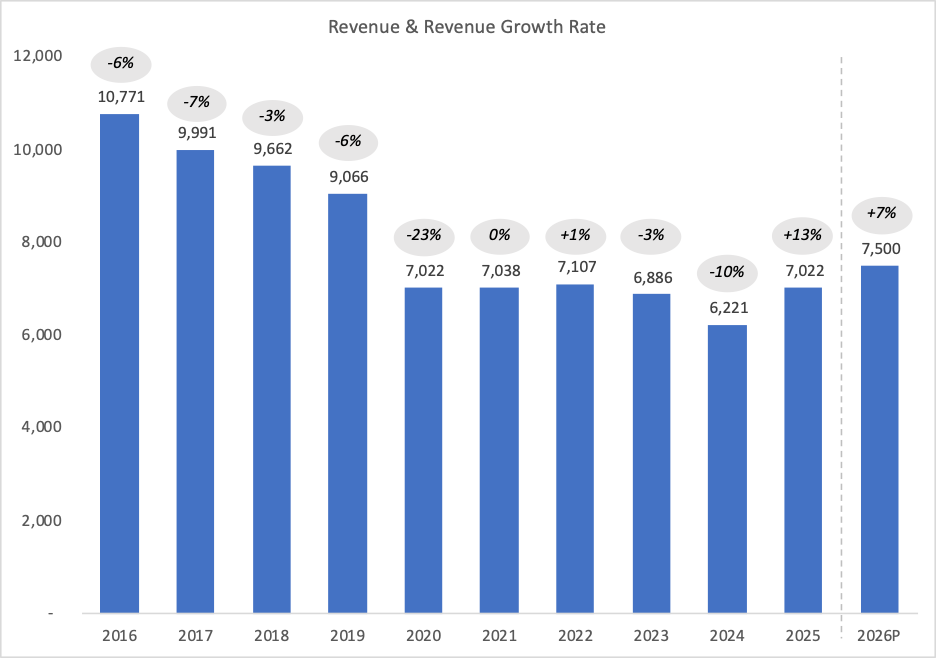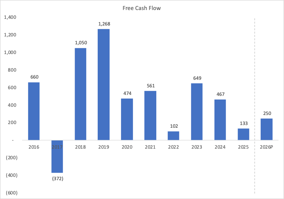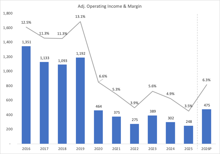 4Q25 Revenue of $2b was down 9% YOY on a pro forma basis, due to declining equipment sales and falling post-sale revenue (i.e., supplies, servicing). Adjusted operating margins compressed 140bps YOY to a thin 5.0%. Margins were impacted by increased product costs, including tariffs, and by mix shift away from higher margin financing and managed printing. Free cash flow was $184mm, $150mm lower than 4Q24.