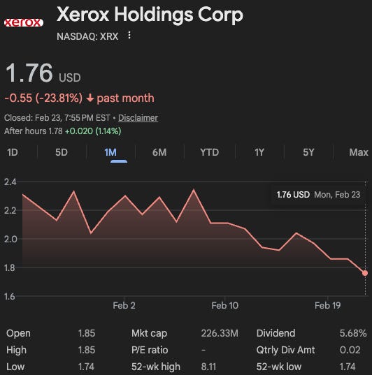 Xerox’s unsecured notes were already in the dumps. The company’s nearest dated unsecureds — $750mm of 5.5% senior unsecured ’28 notes — are now pricing in the low 40s. The longer dated ones, the high 20s and low 30s.