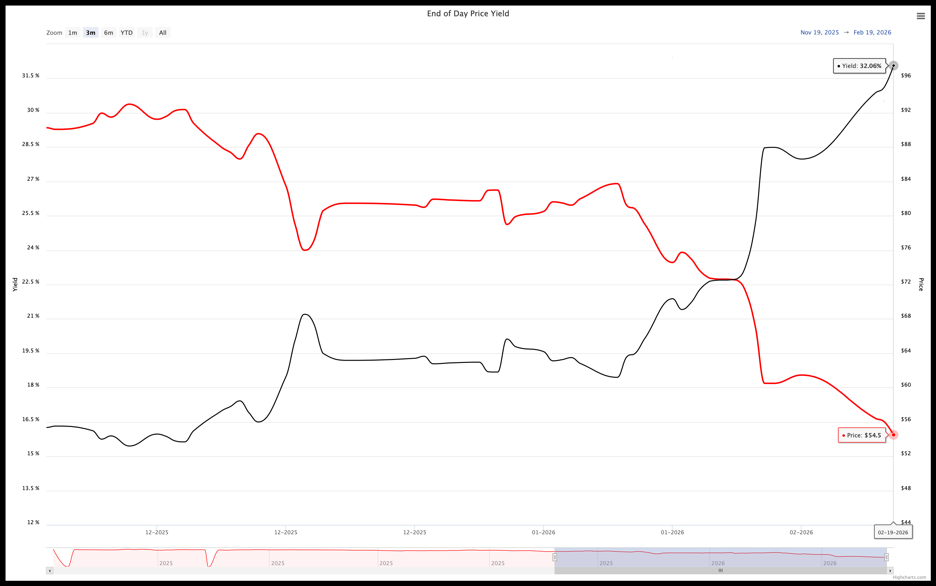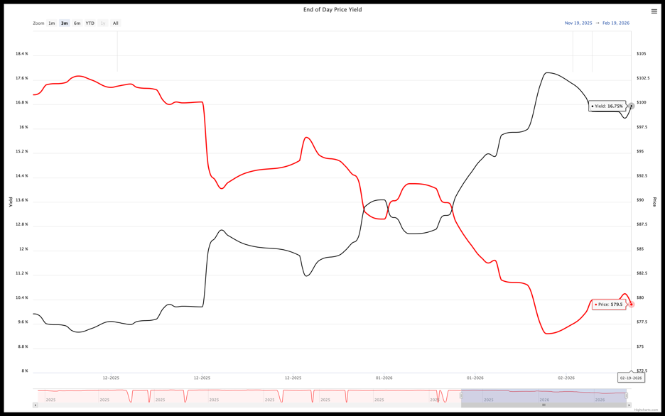Xerox’s $500mm of 13.5% senior secured 2L notes due ’31, which were trading in the 90s when we last checked on the company in early December, dropped to the mid-50s. it was the worst performing high yield bond the week ending February 20, 2026.