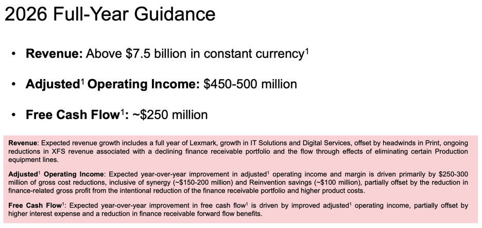 In the short term, the deal provides Xerox with cash needed to fund its ongoing operational restructuring efforts, including the integration of recent acquisitions (Lexmark, acquired in July ’25 for $1.5b and ITSavvy, acquired in November ’24 for $400mm); in the long term, it further complicates a complex capital structure, yet provides the company with greater liquidity to opportunistically address its huge pile of debt over time.