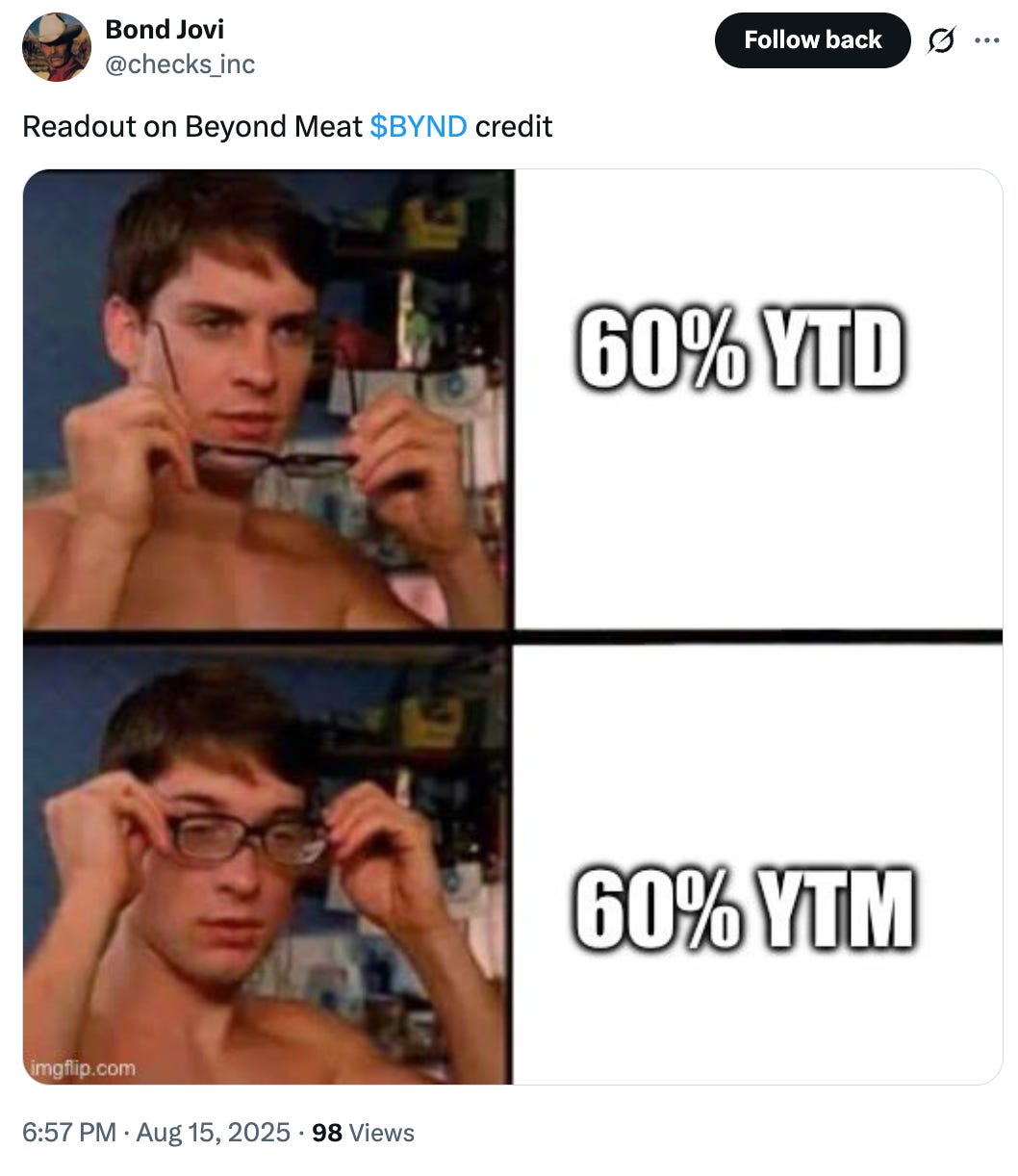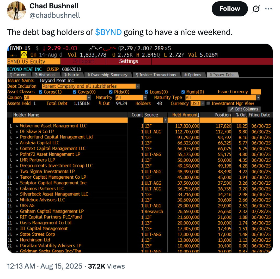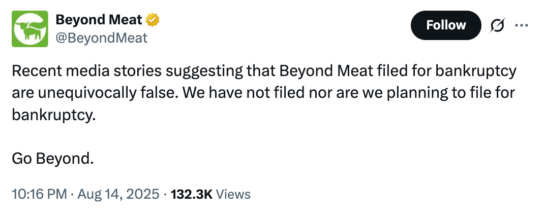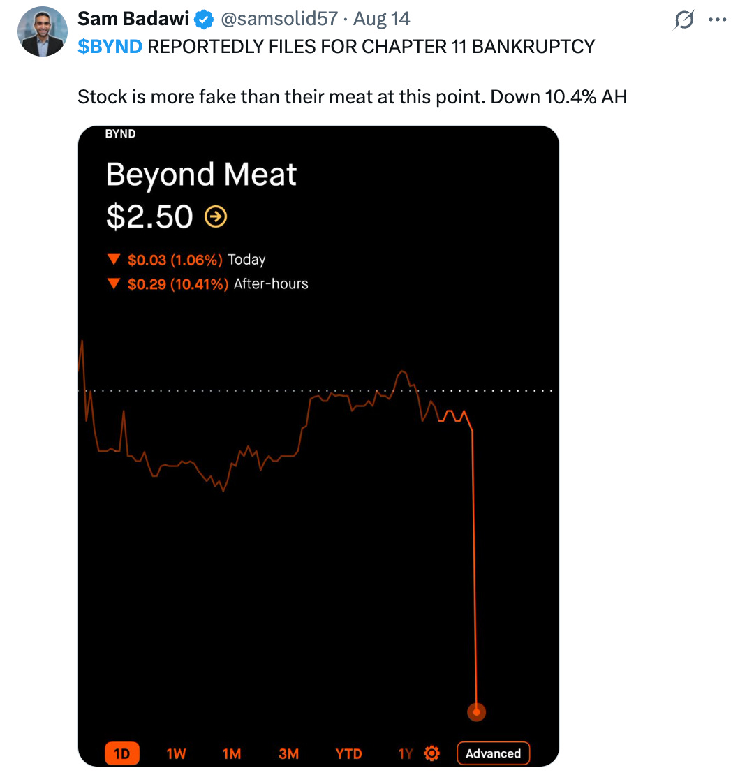 All of which makes the “Beyond Meat has filed for bankruptcy” chatter on X and in C-list media earlier this week extra wrong amusing (hence Mr. Bushnell’s “nice weekend” comment 👆). Here 👇, as just one example, is an X user with the handle samsolid57 with the not-so-solid fake news blasted to his 17.5k followers: