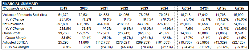 For 2Q’25, BYND reported net revenues of $75mm, a 19.6% decrease YoY, gross profit of $8.6mm, a 37.4% decrease YoY, and net loss of $29.2mm ($0.38/share). BYND also booked negative $22.1mm of adjusted EBITDA and burned through $33mm in operating cash flow.