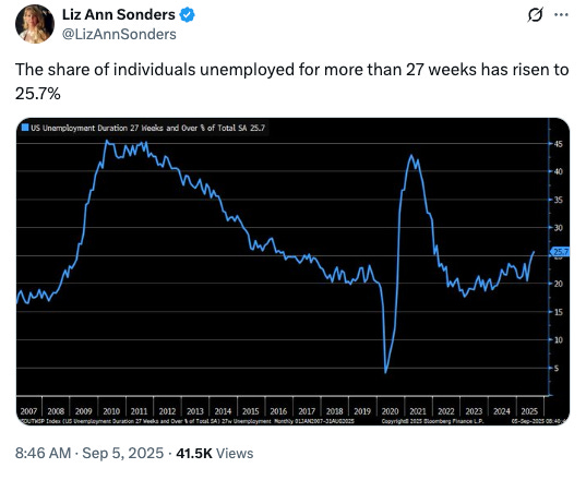 Similarly, manufacturing is contracting — a curious result considering one of the premises behind tariffs was the reshoring of manufacturing capacity. 12k jobs evaporated in August adding to the 66k that had disappeared already so far this year.