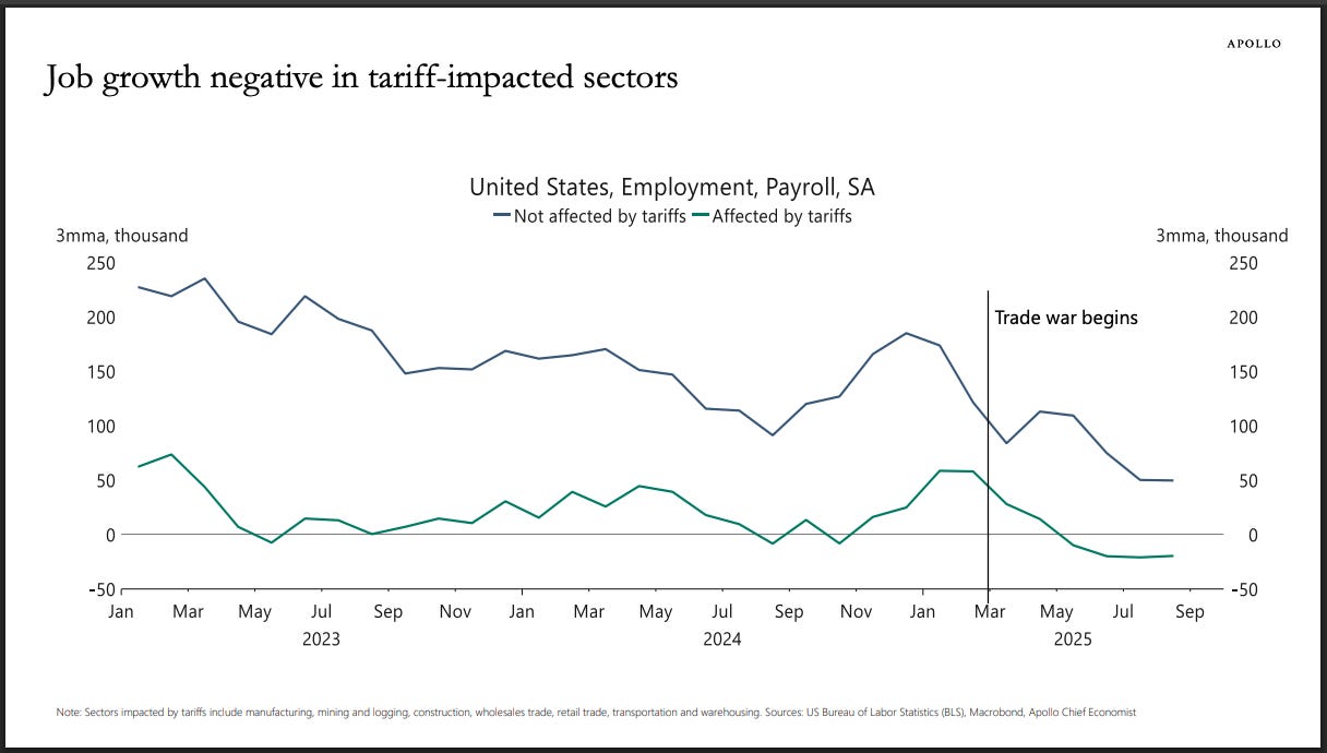 “Splitting employment growth into tariff-impacted sectors and sectors not directly impacted by tariffs shows that the slowdown in job growth is broad-based, and job growth in tariff-impacted sectors is now negative….”