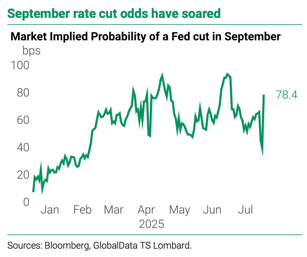 First, the US Bureau of Labor Statistics (“BLS”) released its July nonfarm payrolls report and the unemployment rate rose from 4.1% to 4.2% — nothing terribly surprising there* — but job growth came in at merely 73k versus expectations of 104k.