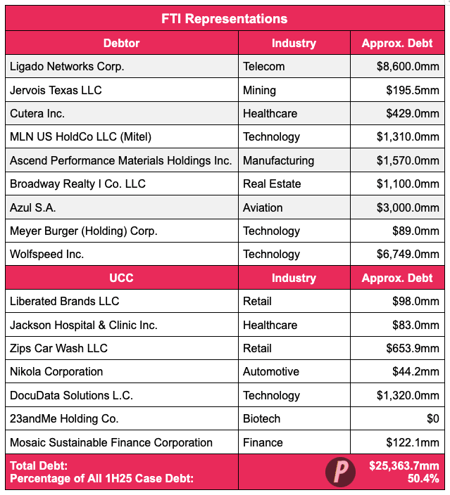 PETITION readers know that we’ve given FTI a lot of sh*t this year which is, in part, just a curse of FTI being a public company. We subsequently ate some crow and for good reason: FTI has actually crushed it this year in RX circles, topping all financial advisors in 1H’25 with 16 total company and UCC mandates (not to mention a healthy number of first lien lender and other reps). Take a gander 👇: