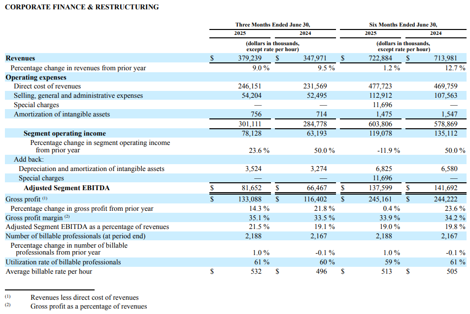 “In Corporate Finance & Restructuring, record revenue of $379.2 million increased 9%. The increase in revenues was primarily due to increased demand for restructuring and transaction services and higher realized bill rate, which was partially offset by lower demand for transformation and strategy services. Record adjusted segment EBITDA of $81.7 million or 21.5% of segment revenue compared to $66.5 million or 19.1% of segment revenues in the prior year quarter. The increase in adjusted segment EBITDA was primarily due to higher revenue, which was partially offset by an increase in compensation.” (emphasis added)