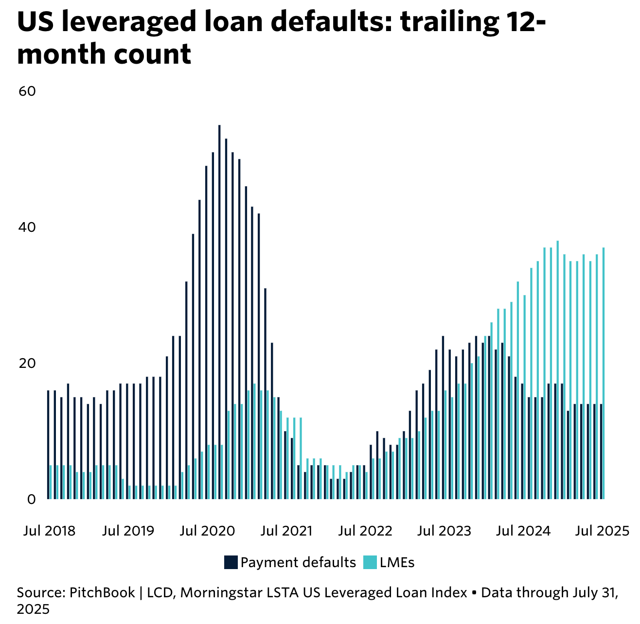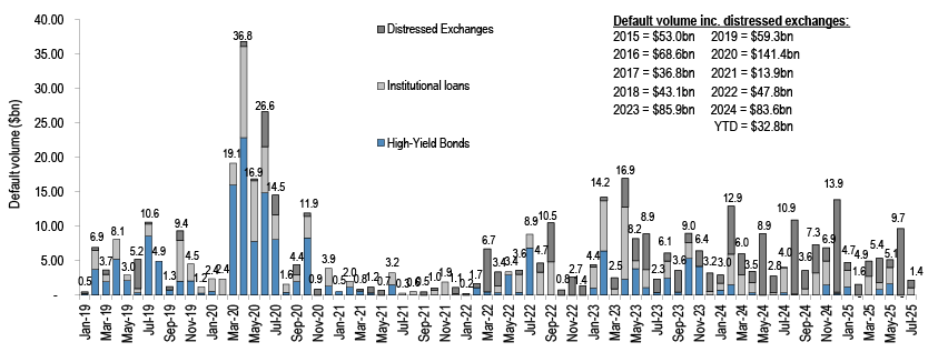 “There were two payment defaults totaling $1.1bn in loans and two distressed transactions totaling $288mn in loans … [y]ear to date, there have been a total of 36 defaults/LMEs totaling $32.8bn, down meaningfully from activity over the first 7 months of the last 2 years: