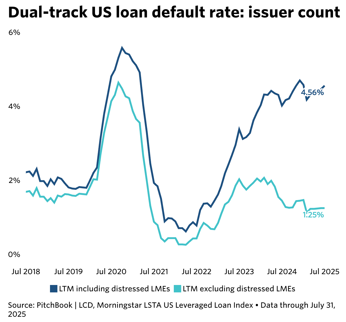 Using a slightly different methodology, Pitchbook pegs the syndicated leveraged loan default rate slightly higher, but also parses out LME/distressed-exchange-triggered defaults: