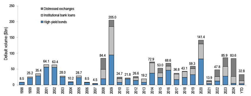 2024: 46 defaults/LMEs totaling $41.1bn (-20%)
