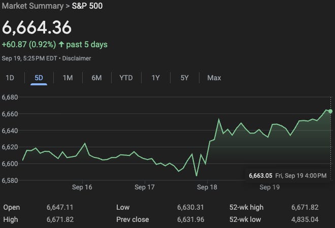 Because the Fed plot ultimately lacked drama — as we noted Wednesday, the Fed hasn’t strayed from market predictions since the Great Financial Crisis — we watched with dopamine-fueled interest as the Trump administration seemed to (indirectly) Ned Stark (verb) Jimmy Kimmel, stirring up all kinds of uproar. We won’t make the mistake of delving into that political morass but for all of the talk of the “end of free speech” and “the end of democracy” … both … *checks notes* … decidedly baaaaad things … the market gave literally zero f*cks about any of it: the S&P 500 closed up nearly 1% on the week.