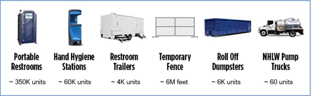 The enterprise rents out porta-potties and related products to the Super Bowl, the Federal Emergency Management Agency, music festivals, homebuilders, and the construction market.