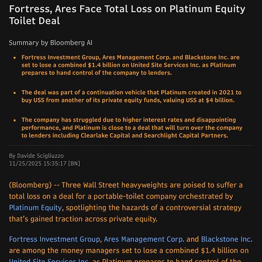 Indeed, the debtors are “… the United States’ largest provider of portable sanitation systems and related ‘site services’ …,’ with the construction market accounting for 70%+ of their revenue.* Their business was built through ~134 roll-up acquisitions of existing, local service providers dating back to 2010. In ‘17, Platinum Equity Advisors LLC (“Platinum”) stepped in as sponsor, and in November ‘21, a Platinum continuation vehicle, funded by Fortress Investment Group (“Fortress”), Ares Management Corp. ($ARES) and Blackstone Inc. ($BX), took it off the prior Platinum funds’ hands in a deal valuing the business at ~$4b.