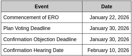 A motion to shorten notice in connection with bid procedures is already on the docket (to be heard on January 12, 2026). We’re going to assume that the debtor’s proposed timeline will hold because it literally cannot afford it not to.
