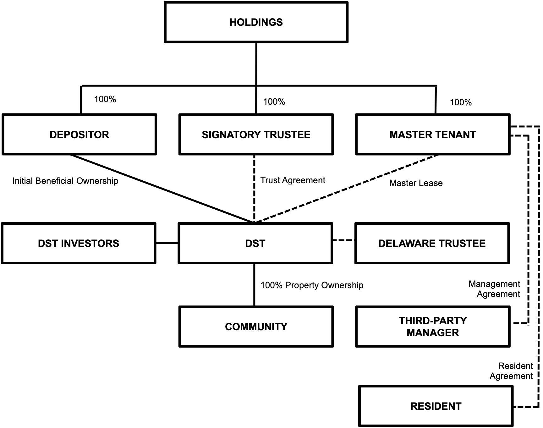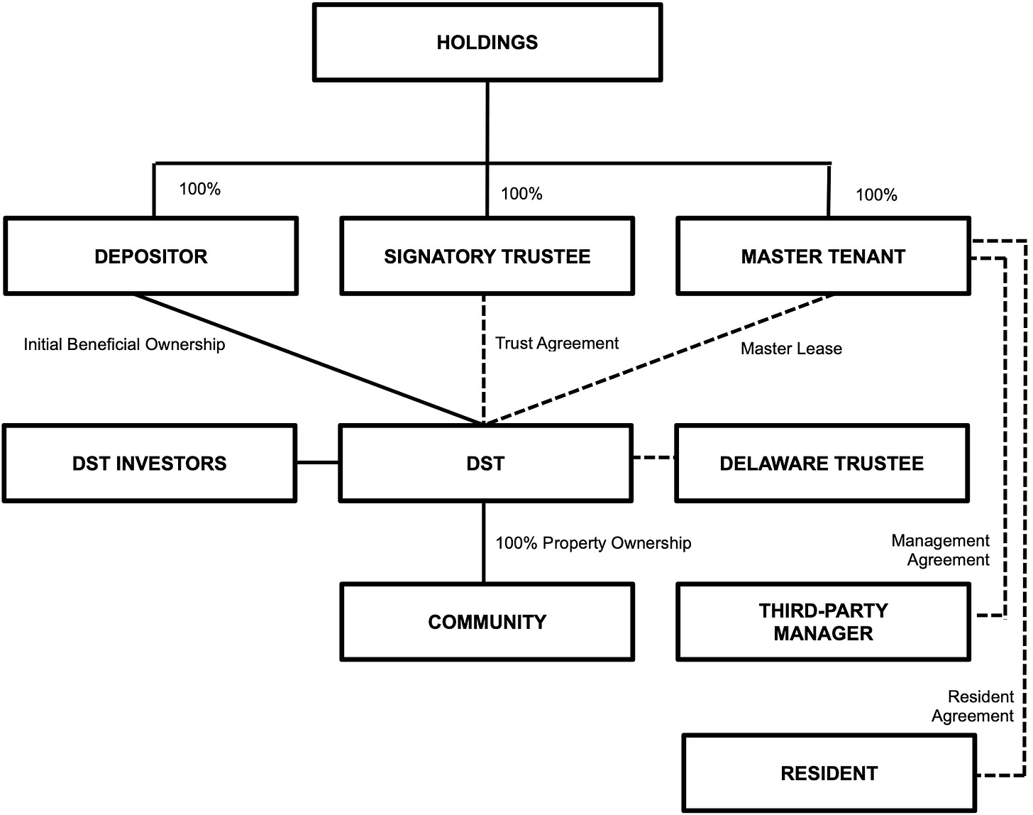 Before that, some background. To raise capital to open new communities and grow the business, the debtor sponsor took two approaches. Initially, it privately placed debt and equity via now-debtor investment funds, the proceeds of which were supposed to finance affiliate developments, provide short-term bridges to affiliates , or invest in real estate. Then, starting in ‘20, the debtors got craftier by raising capital using Delaware statutory trusts (“DSTs”), selling the beneficial interests in the the trusts and allowing investors to potentially reap substantial tax benefits through a 1031, like-kind exchange.** The debtors used those proceeds to purchase properties held by equally-now-debtor DSTs, each of which, for tax-law reasons (😴), served as a landlord to a now-debtor master tenant (collectively, “MTs”) and is managed by a now-debtor signatory trustee (collectively, “STs”).*** It’s complicated, but Mr. Jones — or, said more truthfully, a lackey — sketched up a summary of how it all works: