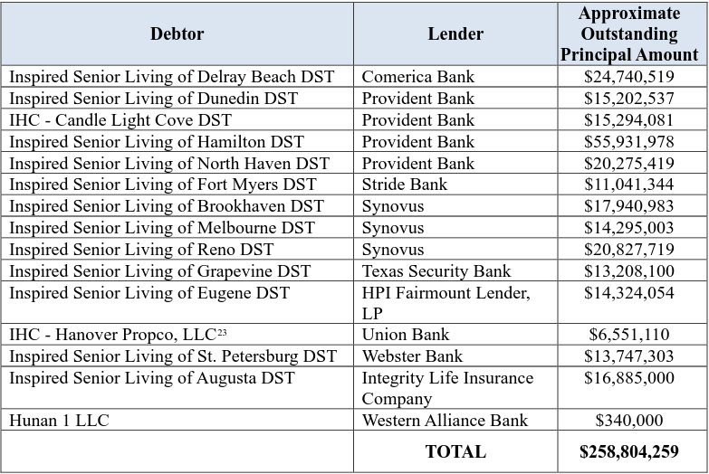 On February 2, 2026, Scottsdale, AZ- based Inspired Healthcare Capital, LLC (the “debtor sponsor”), Inspired Healthcare Capital Holdings, LLC (“holdings”), and 159 affiliates (collectively, together with the debtor sponsor and holdings, the “debtors”) filed chapter 11 sale cases in the Northern District of Texas (Judge Mullin). Per Benjamin Jones, the debtors’ CRO and managing director at Ankura Consulting Group, LLC, the debtors, which were founded in ‘16, “…acquire or develop and oversee upscale Senior Living Communities (‘Communities’) throughout the country,” each of which “… offers its residents [] a welcoming and peaceful place where they are treated with dignity.”