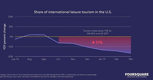 As if the retail situation isn't bad enough, Foursquare is reporting that leisure tourism is down a normalized 11% for Q4 '16 and Q1 '17. A proper inference to be made is that this could very well extrapolate out negatively for high tourist locales like New York City which, in many respects, depend on tourist spending for revenues. It will be interestin…