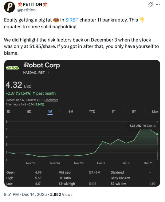 On December 14, 2025, MA-based iRobot Corporation ($IRBT) and two affiliates (together, the “debtors”) filed basic-as-all-f*ck prepackaged chapter 11 bankruptcy cases in the District of Delaware (Judge Shannon). We’ve covered this turd four times already … most recently here …