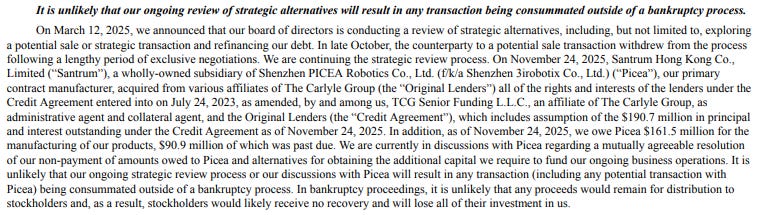 On December 1, 2025, the company dropped a brand new 8-K indicating that Santrum Hong Kong Co., Limited (“Santrum”), a wholly-owned subsidiary of Shenzhen PICEA Robotics Co., Ltd. (f/k/a Shenzhen 3irobotix Co., Ltd.) (“Picea”) had taken out Carlyle “…assumed the $190.7 million in principal and interest outstanding under the Credit Agreement.” Who is Picea?* See that reference 👆to a “primary contract manufacturer?” Right, that’s Picea and it is owed $161.5mm for the manufacturing of products, $90.9mm of which is past due. “The [c]ompany and Picea are engaged in active discussions regarding a mutually agreeable resolution of the non-payment by the [c]ompany of amounts owed to Picea.” We bet they are!**