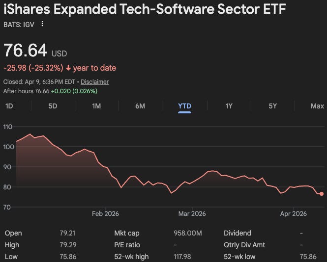 What is the opportunity, though? SaaS? That 29.7% 👆? Good luck determining the terminal value there. Whichever analyst is underwriting a fresh loan into those businesses ought to get airdropped straight into Tehran sans backup because he’s obviously got balls the size of watermelons. On Tuesday, the market turned its attention away from the Strait of Hormuz for a second and suddenly remembered SaaS; it be like: