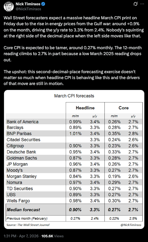 4. Inflation (Long Elevated CPI). The US Bureau of Labor Statistics’ Consumer Price Index report for March comes out this morning not long after this publication (Friday, April 10, 2026), and it may not be pretty. At least not based on this: