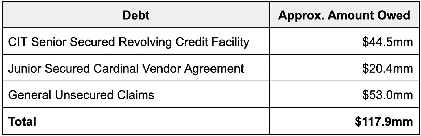 Which left CIT holding the bag. Except not really because it also peaced out in July ‘23 by assigning its then ~$37.6mm in debt to CS One, LLC (“CS One”), an entity owned by the debtors’ and CareOne’s 100% shareholder Daniel Straus.** And since that assignment, no amounts have been paid back, so the balance has grown to a tidy ~$44.5mm, including $1.5mm in early August ‘25-provided bridge financing. Here’s the full petition date debt stack:***