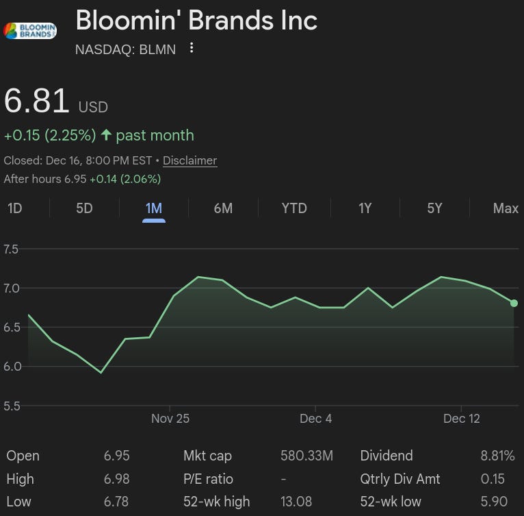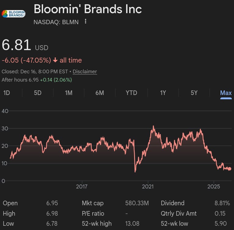 Because weâve recently been on the topic of restaurant brands, letâs dive into Tampa, FL-based Bloominâ Brands, Inc. ($BLMN), a restaurant holding company with several casual â and one fine dining â brands under its belt. The most notable of the bunch is Outback Steakhouse (âOutbackâ), the Australia-themed casual chain for folks who have never been to Australia. Its signature dish is a carved-up, deep-fried âBloominâ Onionâ âŠ