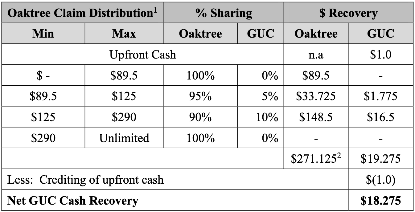 Those came a few days later. On December 10, 2025, the debtors filed a motion for approval of the settlement. Under it, Oaktree will turn over to GUCs a percentage of cash received (when and if that happens) on account of (i) its claims, directly or (ii) any reorg debt or equity it receives if the sale process doesnât produce a buyer (spoiler alert: it wonât).