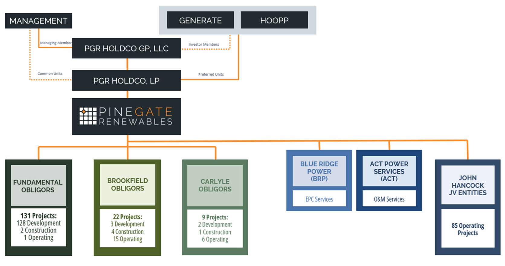 The debtors are represented by Latham & Watkins LLP (Ray Schrock, Andrew Parlen, Alexander Welch, Jason Gott, Jonathan Gordon) and Hunton Andrews Kurth LLP (Timothy “Tad” Davidson II, Philip Guffy, Brandon Bell) as legal counsel, Alvarez & Marsal North America, LLC (Mark Rajcevich) as financial advisor and CRO, and LAS as investment banker. William Transier, Neal Goldman, and Todd Arden compose the debtors’ special committee. BAM is represented by Paul, Weiss, Rifkind, Wharton & Garrison LLP (Brian Hermann, Bob Britton) and Porter Hedges LLP (John Higgins, Megan Young-John) as legal counsel. CG is represented by Milbank LLP (Tyson Lomazow, Andrew Harmeyer) and Haynes and Boone LLP (Ian Peck, Charles Beckham) as legal counsel. Fundamental is represented by Sidley Austin LLP (Duston McFaul, Maegan Quejada, and Ishani Patel) as legal counsel. Back Bay Solar, LLC, as JV partner, is represented by Greenberg Traurig, LLP (Julia Frost-Davies, Charlie Liu, Brian Greer, Karl Burrer, Kristen Jacobsen) as legal counsel. Healthcare of Ontario Pension Plan Trust Fund is represented by Weil, Gotshal & Manges LLP (Matthew Barr, Chase Bentley, Teddy Cohan, Gabe Morgan) as legal counsel. LPL Solar LLC is represented by Eversheds Sutherland (US) LLP (David Wender, Danielle Barav-Johnson) as legal counsel. Equity holders GC PGR HoldCo Member, LLC and GC PGR HoldCo, LLC are represented by Kirkland & Ellis LLP (Chris Marcus) as legal counsel.