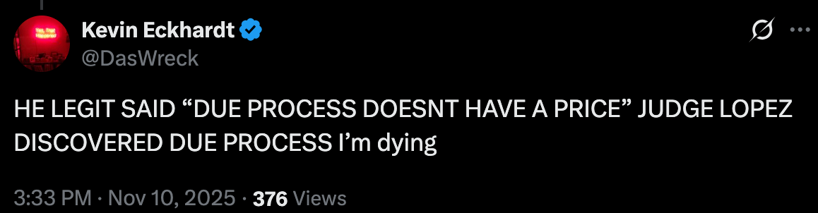 Perhaps Judge Lopez will notice it and, you know, focus on … due process? Johnny can dream.