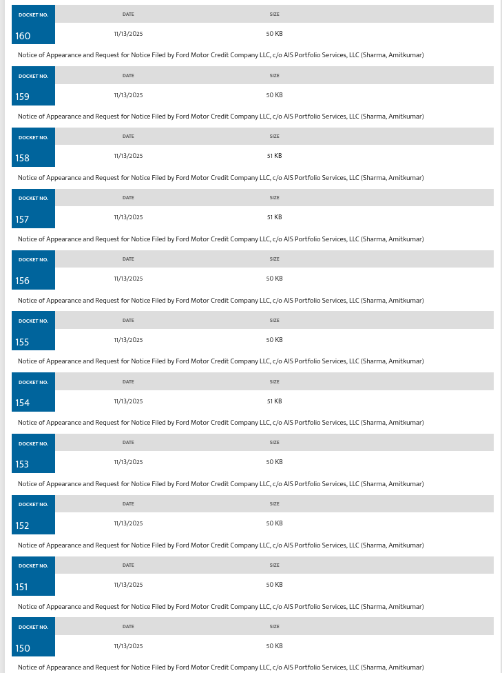 While on the topic of, LOL, due process, Ford Motor Credit Company LLC’s Amitkumar Sharma is keen on getting his. Since the hearing, he’s filed forty-four requests for notice on the docket.