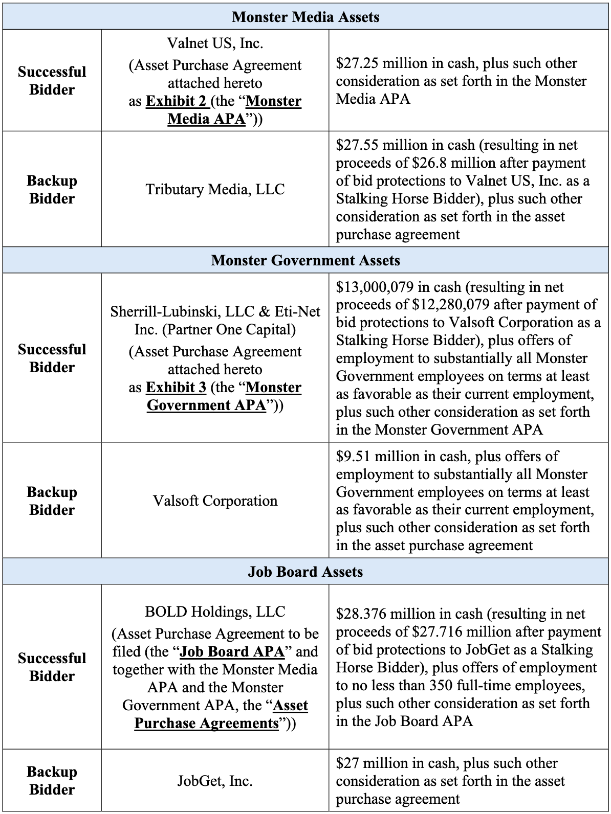 When we last checked in, the debtors were gearing up for a July 8, 2025 hearing on their bidding procedures and the designation of Valnet Inc. (“Valnet”), Valsoft Corporation (“Valsoft”), and JobGet, Inc. (“JobGet”) as stalking horses for their three business segments: