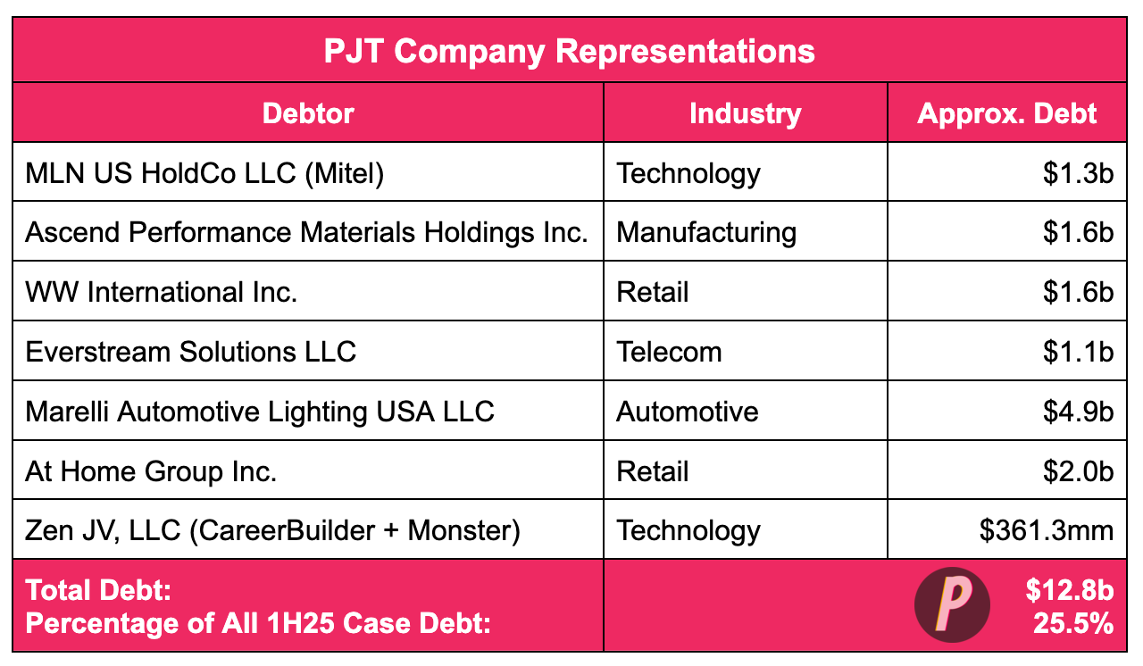 By our count, PJT racked up the most company-side mandates — taking down some high quality wins too, like MLN US HoldCo LLC (Mitel), WW International Inc. (a/k/a WeightWatchers), At Home Group Inc., and Marelli Automotive Lighting USA LLC. Take a look for yourself 👇: