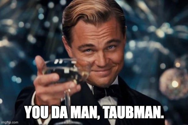 Everything’s up. Everything, that is, other than volatility. Back to Mr. Taubman: