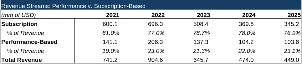 Over the last several years, subscription revenue has composed ~77-81% of revenue, with performance-based making up the remainder: