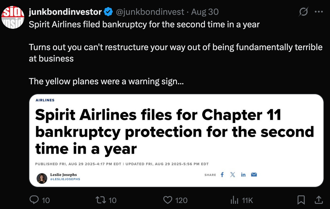 And three days later, on August 25, 2025, Spirit’s largest lessor, AerCap Holdings N.V. ($AER), presumably spooked by the disastrous operational results since emergence, pulled the plug and terminated 36 committed aircraft lease agreements with delivery dates between ‘27 and ‘28, and also sent a notice of default on 37 existing aircraft leases.
