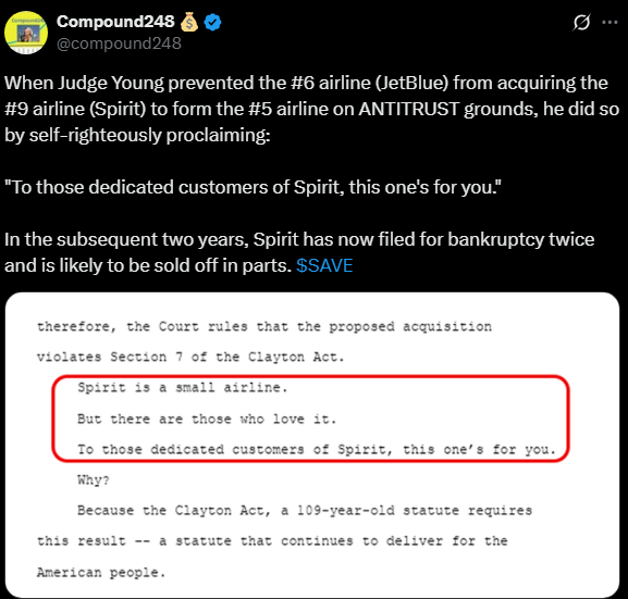 Recall that Spirit filed in November ‘24 after Judge Young, from the U.S. District Court for the District of Massachusetts, did consumers a solid and basically made a filing inevitable after blocking Spirit’s then-pending merger with JetBlue Airways Corp ($JBLU).