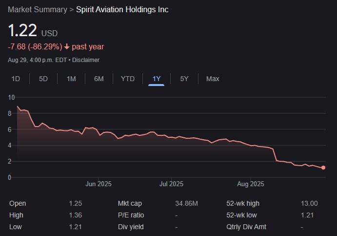 In March ‘25, Spirit got the court’s go-ahead and emerged from bankruptcy. The next month, it then got approval to list on the NYSE American exchange and trading began on April 29, 2025. Here’s a recording of the stock performance: