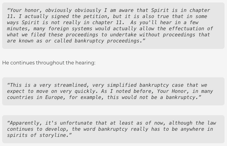“Rather than going back decades or even years, I would instead like to start only a few months ago on November 18th of last year. Because, despite your Honor’s experience with Spirit in its previous surgical lightning round restructuring last fall, I would like to submit that for all intents and purposes, this one and not that one would, in fact, be the company’s first true chapter 11 proceeding.”