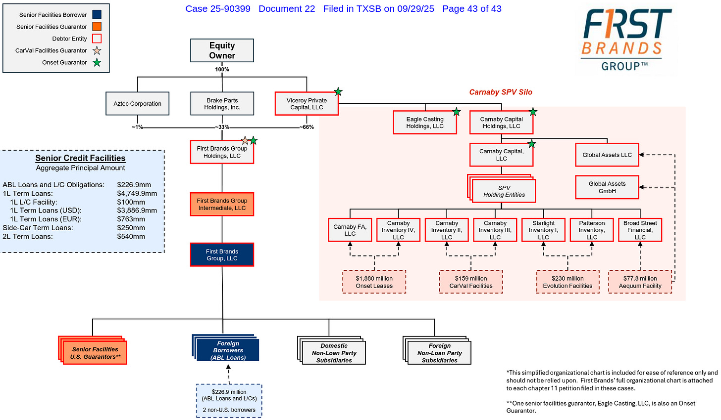 In any event, after a tumultuous few weeks, on September 28, 2025, Cleveland-based First Brands Group LLC (âFirst Brandsâ) and 98 affiliates (collectively, together with First Brands, the â9/28 debtorsâ) slammed hard into chapter 11 in the Southern District of Texas,* joining 13 affiliated companies (the âinitial debtorsâ and, together with the 9/28 debtors, the âdebtorsâ and, together with their non-debtor affiliates, the âcompanyâ) which had filed earlier in the week on September 24, 2025.