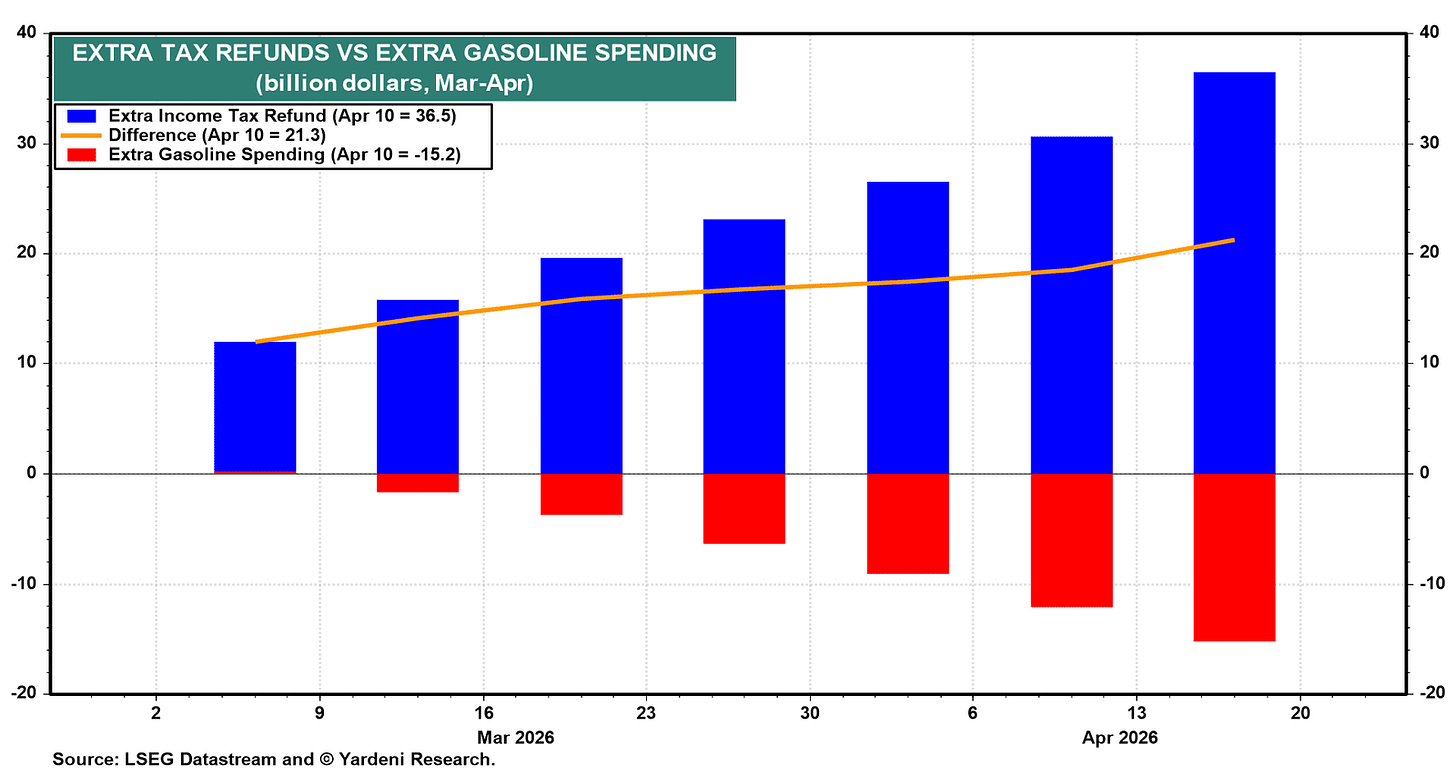 First, from Yardeni Research (paywalled), "Our in-house analysis shows that the increase in income tax refunds from the One Big Beautiful Bill Act more than offsets the rise in gasoline spending since the outbreak of the war. We estimate that the refund tailwind exceeds the gasoline headwind by more than $20 billion as of early April."