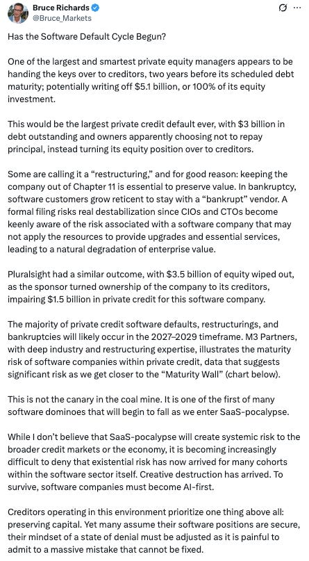 The fine folks there go on to point out that the 7.23% distress ratio cited ☝️compares to 4.34% at the end of ‘25; they note further that the dual-track default rate including LMEs is 3.48%, “...more than double the payment-only rate, another reminder that liability management exercises are doing significant work to keep formal defaults suppressed.”