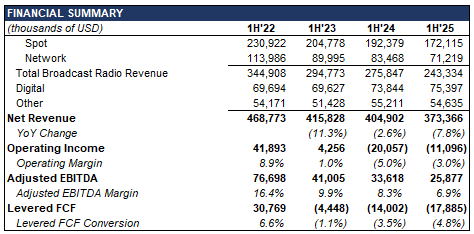 For 2Qâ25, CMLS reported total revenues of $186mm, down 9.2% YoY, which consisted of a 13% decline in broadcast radio. Adjusted EBITDA was $22.4mm, compared to $25.2mm for 2Qâ24.