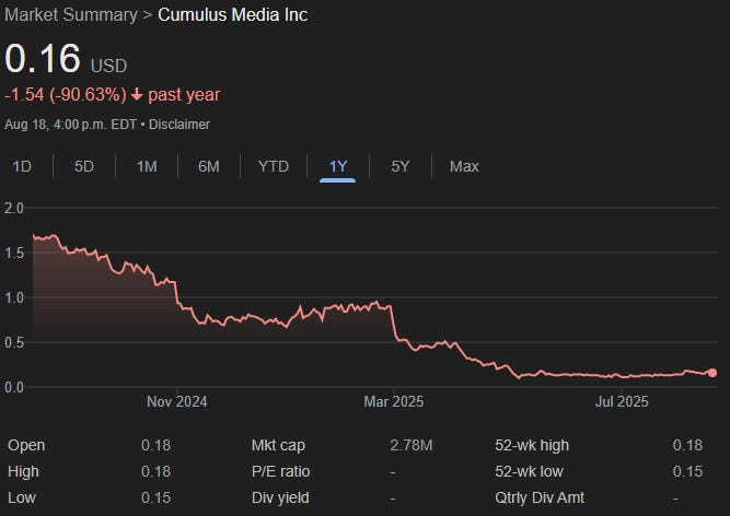 We originally initiated on radio operator and former chapter 11 debtor Cumulus Media Inc ($CMLS) here, when the stock was sitting pretty ⊠lol âprettyâ ⊠at $4.82/share: