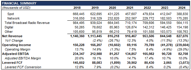 For 1Qâ25, CMLS reported total revenues of $187.3mm, down 6.4% YoY, which consisted of a 10.6% YoY decline in broadcast radio revenue. Adjusted EBITDA was $3.5mm, compared to $8.4mm for 1Qâ24.
