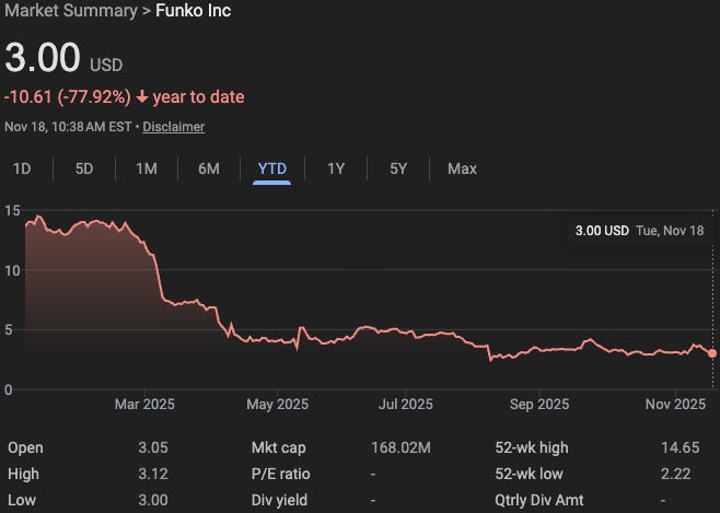 Unsurprisingly, Funko’s stock is getting f*cking annihilated and is down 77% year to date.