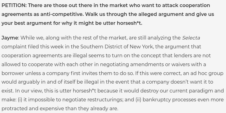 Okay. The PETITION LLC team won’t profess to be antitrust experts — we’re in restructuring like (most of) the lot of you — but, to be 💯 with y’all, the complaint didn’t put the fear of g-d into us. You read the terms, right? Every single 1L noteholder got the same, exact offer; it’s just that the excluded holders didn’t hold >50% of the 1L notes and the AHG did.