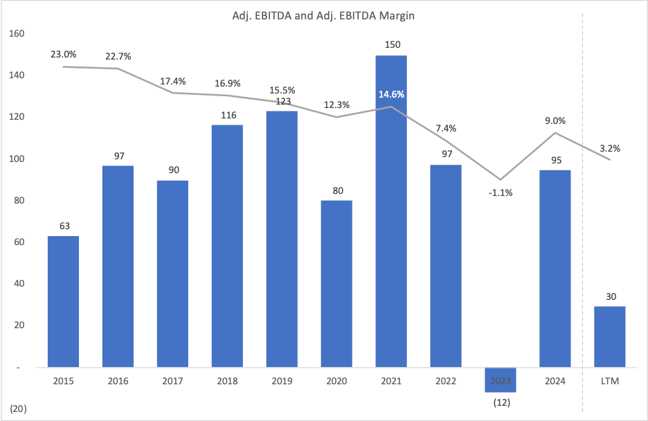 A combination of the above factors and lower operating leverage has strained Adj. EBITDA even further.